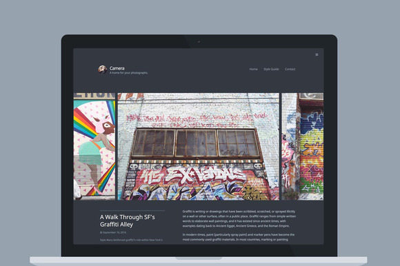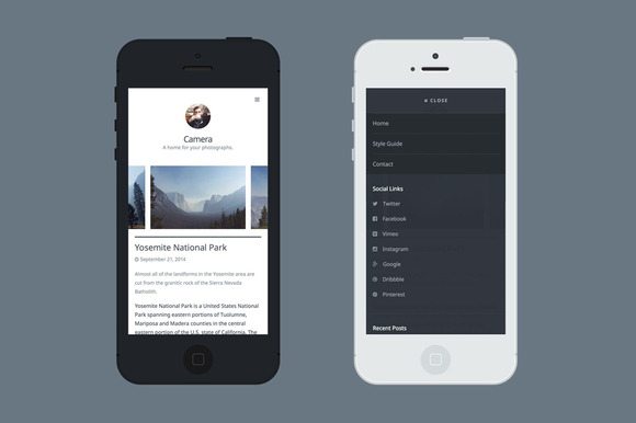 ✔ Distraction Free Camera tucks away all of the distractions to let visitors focus on your content. Responsive site navigation, social links and widgets are available via a slide-out sidebar.