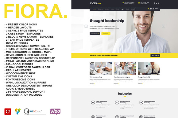 Using Fiora WP you can easily create a modern website for any service providing business with real content. Easily edit the real content and compose the page layout with drag & drop page builder.