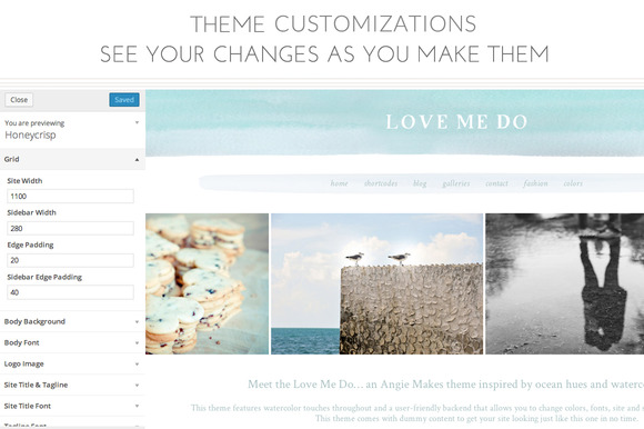 Introducing the Love Me Do WordPress Theme. The Love Me Do features a rustic watercolor design with loads of great options for customization options and ease of use. Baked into the theme are amazing typographic controls, color controls, the ability to set your site and sidebar width, amazing shortcodes, and so much more. This theme lets you customize the design of your site using WordPress' live preview feature so you can see all your customizations live as you make them. Configuring your WordPress site has never been so easy.