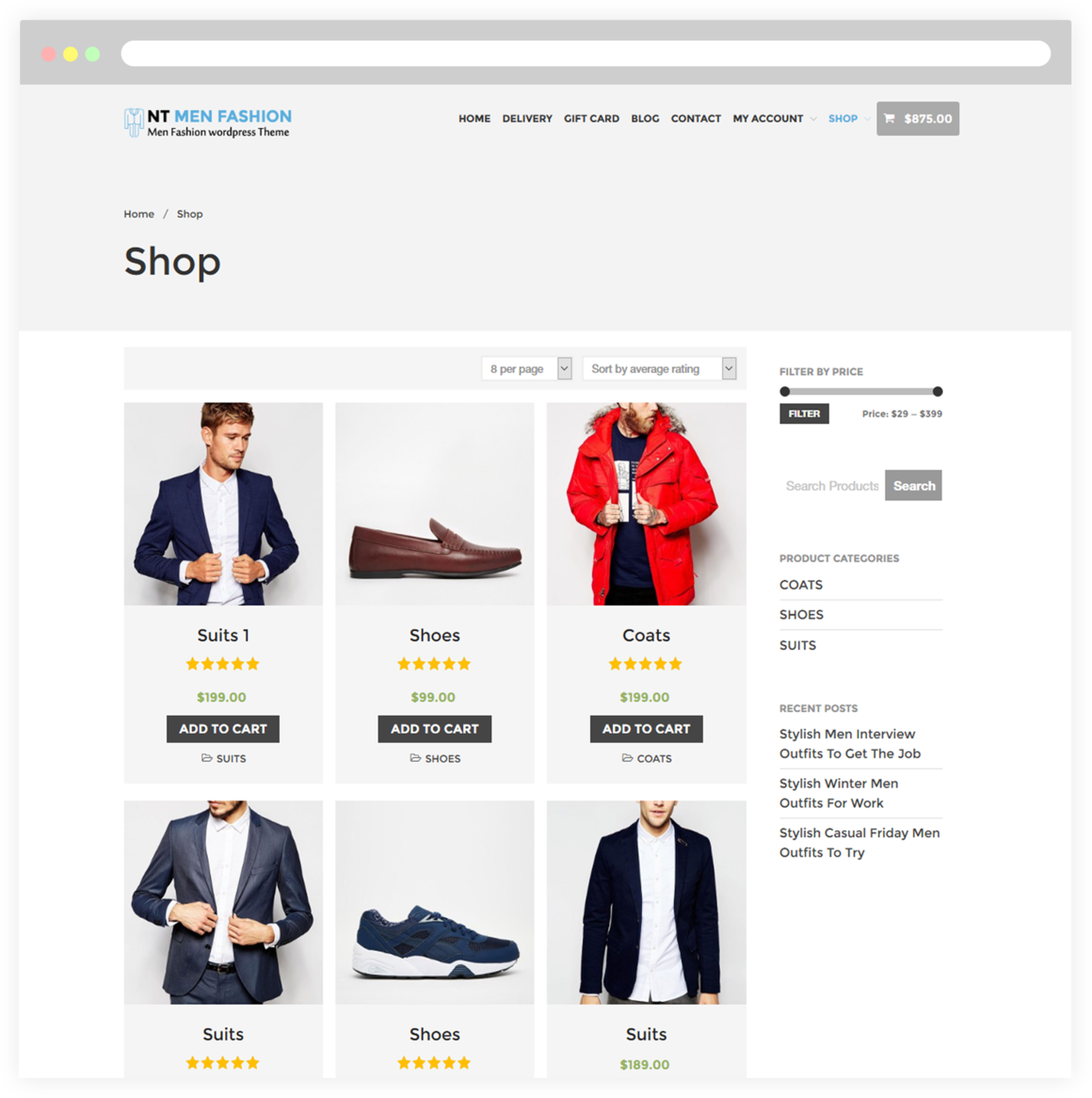 - SHOP PAGE The shop page is especially important to classify kinds of items such as coats, shoes, suits…from your shop. This page based on WooCommerce plugin and extended style for this template.