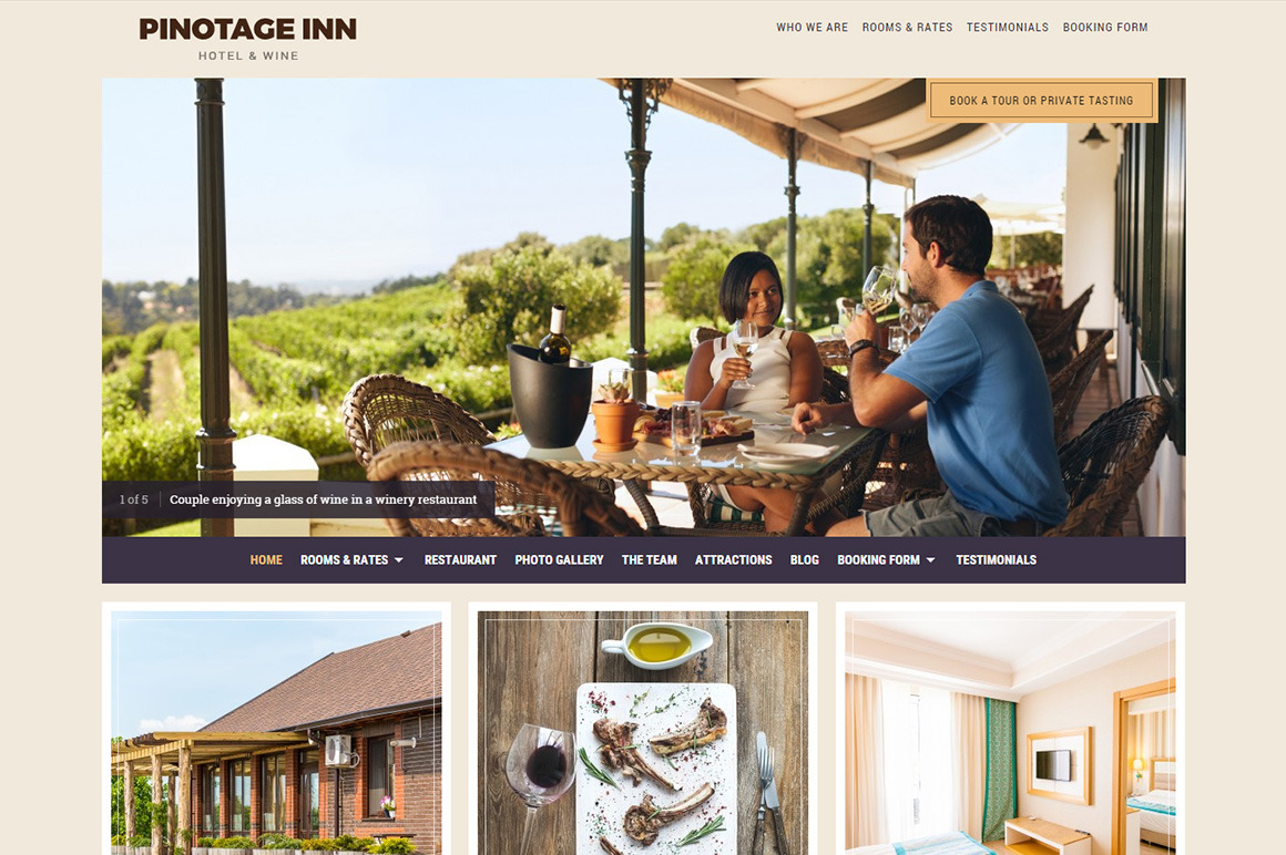 Pinotage is a responsive WordPress theme developed for hotels and wineries. Thanks to our custom page templates the theme will accommodate websites with low or high amounts of content. Compatible with popular plugins like WPML, The Events Calendar, Gravity Forms, etc.