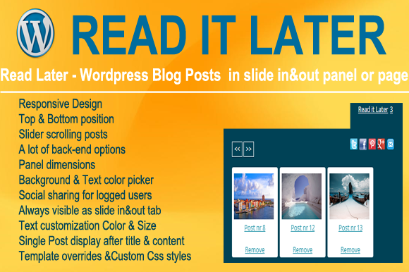 Possibility to display it in 2 positions top&bottom of the site ,visible to blog page/category & single post. The posts are displayed as scrolling slider in Responsive Design . Each post added to the Read Later , have displayed image,title and also it is linked to the post . Each post can be removed from the read later list. Can be also removed all the posts inserted to the read later list with just one click “Remove all”.