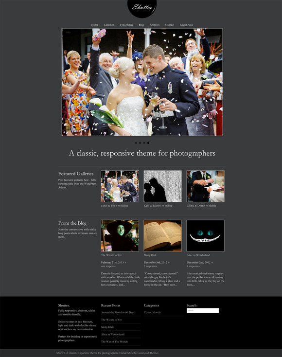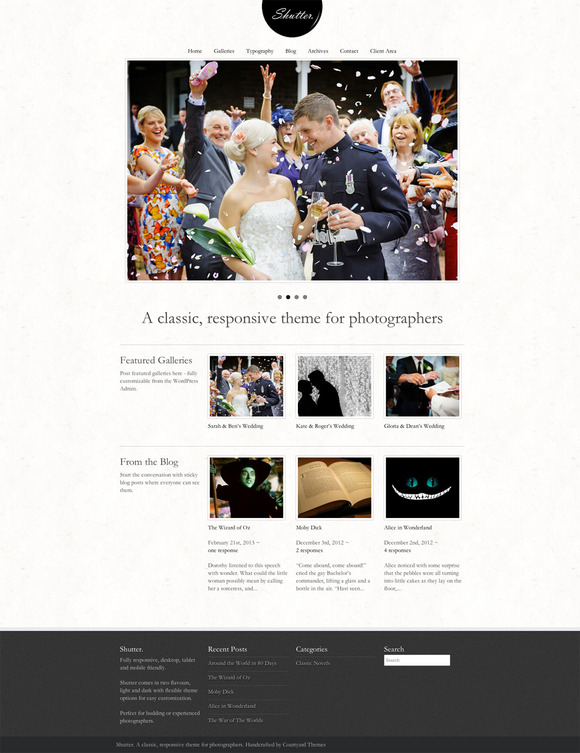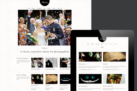 Designed just for photographers. Shutter comes in two flavours, light and dark with flexible theme options for easy customization. Choose to display your work with the hero slider, in-built galleries or blog posts. Shutter is fully responsive and displays beautifully on your desktop, tablet and mobile device.