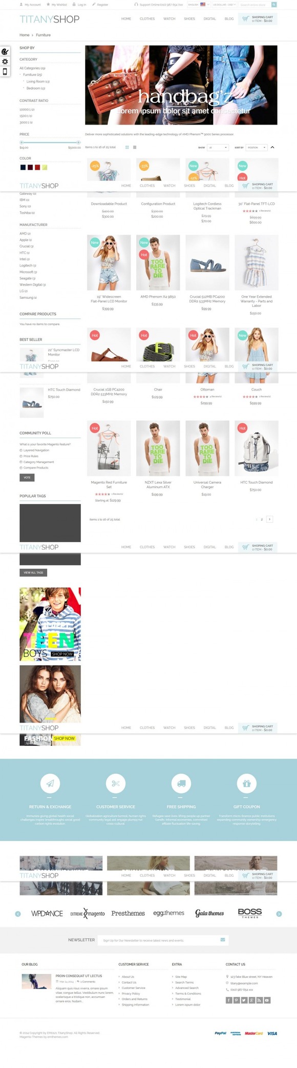 itany a Responsive Magento Theme for Fashon Boutique market impresses customers at the first sight by its harmony & pastel style. The structure layout is completely redesigned out of the box, provides unique style and functionalities. Mega menu at the top pae show product categories, cms page, promotional banners very well. Beautiful revolution slideshow with various html5 transition effect makes your promotional products look luxury and classic. Featured products, bestselling products, new arrivals products, special offers arrange at catchy positions and balance in the general layouts. One step checkout extension let your customer paid for products quickly. Filtered products navigation lets customers find products they want easily and user friendly. Beside all of that this Magento Theme iscompletely FREE of use.